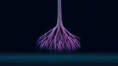 A purple tree with roots is shown in a black background. The image has a futuristic and abstract feel to it