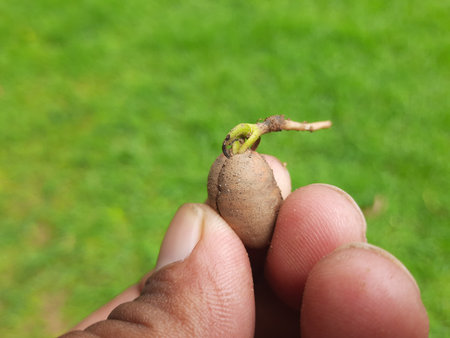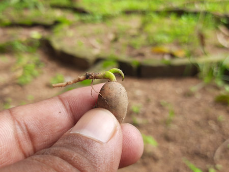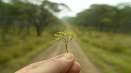 Person holding small plant in front of dirt road with trees in background under clear blue sky