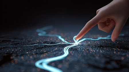 A close-up view depicts a hand interacting with a network of glowing lines. The image showcases digital pathways in bright blue against a dark backdrop. The composition suggests connectivity and technological advancement, potentially suitable for various commercial projects and editorial content.