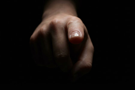 A fair-skinned Caucasian man's fist thrusts towards the viewer, slightly blurred His prominent index finger centers the frame Against a deep blue backdrop, the image conveys determination, power, or aggression The visible fingernail and ready stance suggest confrontation, challenge, or a forceful point This hand is poised for action AI Generative