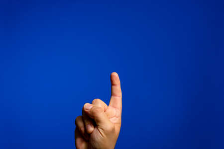 Index finger of a mans hand pointing up asking for a turn to do something. Isolated on blue studio background