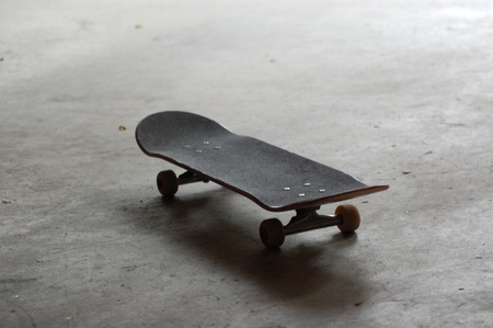 View of an old skateboard on the terrace of the house. Selective focus. Game concept