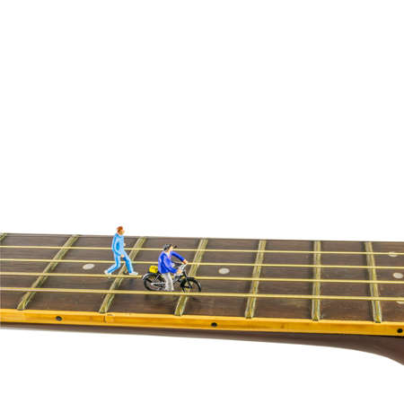 Frets and headstock of a toy ukulele with childish colors on a dark background. Music concept.