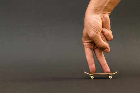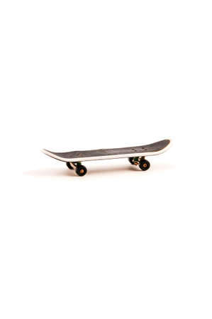 Fingerboard. A small skateboard for kids and teenagers to play with hand fingers. Isolated on black background