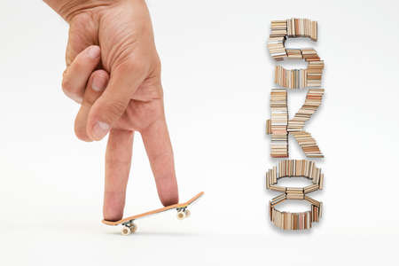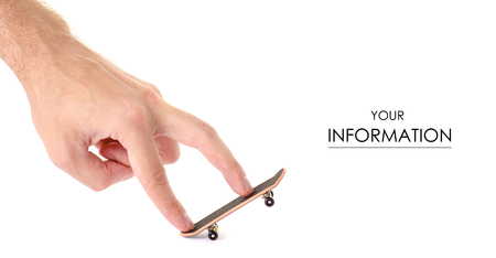 Fingerboard and sk8 text on white background. A small skateboard for kids and teenagers to play with hand fingers