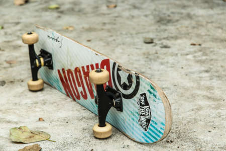 Singapore-08 OCT 2017: abandon skateboard stand on playground closeup view