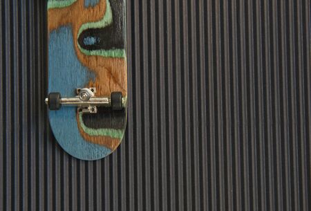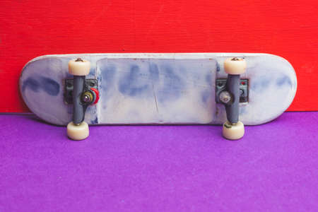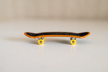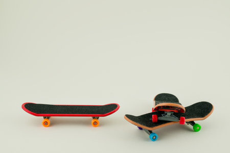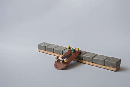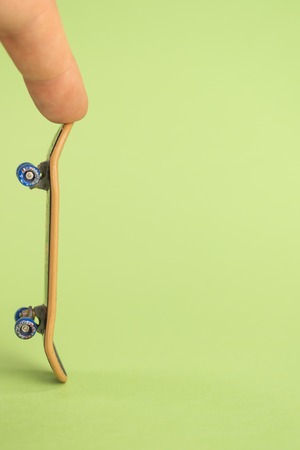 Small skateboard on color background. tiny skate for fingers. fingerboard close up. copy space