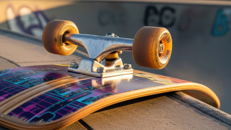 A skateboard is displayed close-up, highlighting its wooden deck and metallic components. The image emphasizes the skateboard wheels with a slightly blurred background. The composition suggests an outdoor environment, with warm sunlight illuminating the scene. Suitable for a variety of commercial applications, it could be used to represent leisure, sport, or recreation.