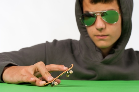 Fingerboard. Man hoplding by two fingers small skateboard on green background. Close up with copy space. Vertical.