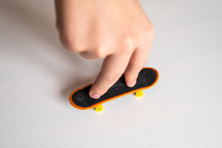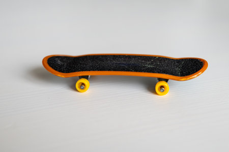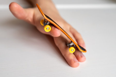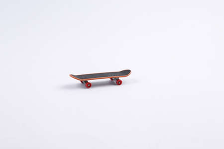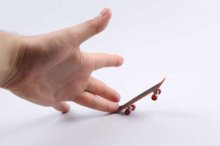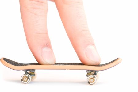 Fingerboard. A small skateboard for kids and teenagers to play with hand fingers. Isolated on white background