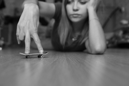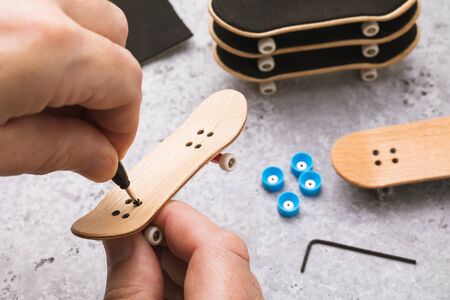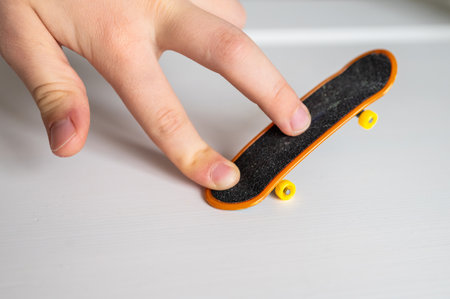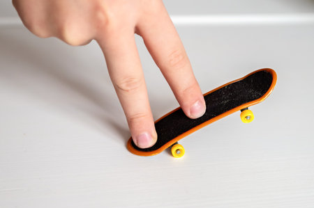 Boy is playing with his finger skateboard at home. Close up shot. Selective focus.