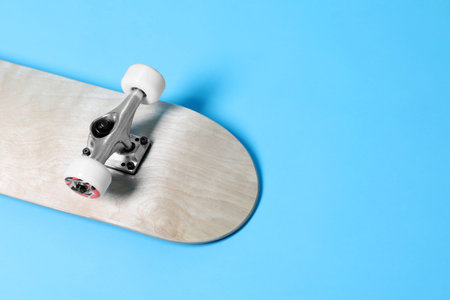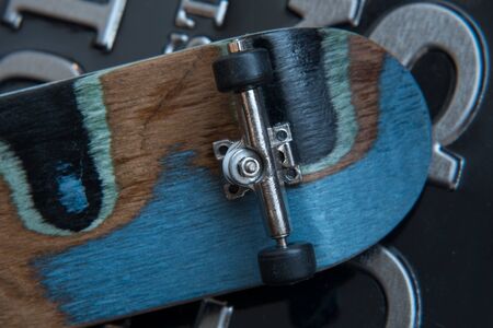 Small skateboard on blue background. tiny skate for fingers. fingerboard close up. copy space