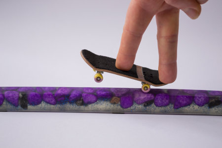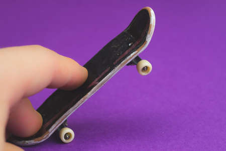 Small skateboard on purple background. fingers on tiny skate. playing with fingerboard. home leisure concept. copy space