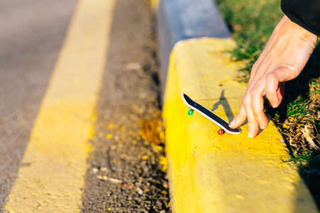 Female hand holds finger skateboard through torn hole yellow paper. concept art. minimalism