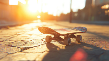 A lone skateboard resting on a sunlit street with cracked pavement, capturing the essence of urban skate culture and freedom.