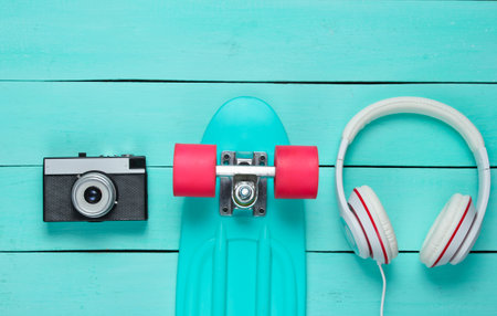 Hipster outfit. Skateboard, headphones, sneakers, retro camera on blue wooden background. Creative fashion minimalism. Minimal summer fun. Pop art. 80s. Copy space. Top view
