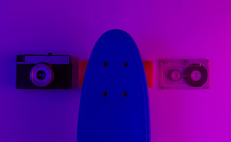 Plastic mini cruiser board, audio tape, retro camera on background with purple pink neon gradient light. Retro 80s objects. Top view