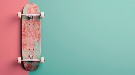 A vibrant skateboard rests on a colorful backdrop of red and turquoise, showcasing dynamic shapes and patterns, perfect for capturing youth culture and leisure activities.