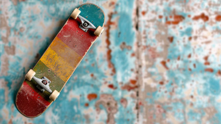 This image features a skateboard leaning against a vibrant teal wall. It embodies the spirit of urban youth culture, highlighting the artistic and dynamic aspects of skateboarding as a sport and lifestyle choice.