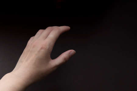 Hand stretches palm up close-up on a dark background