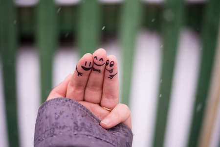 A person holding up two fingers with a smiley face on them.