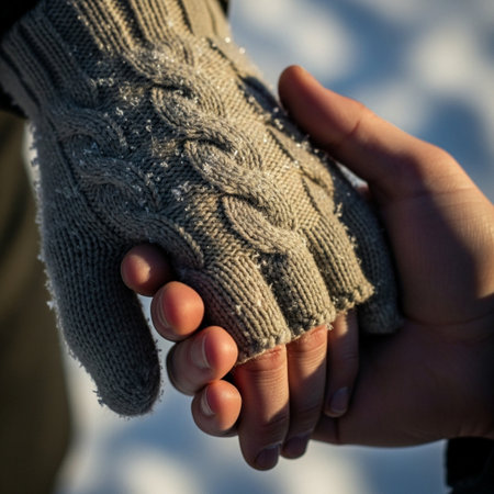 Extreme macro detail of a bundled-up couple's hands walking through a light snow shower.