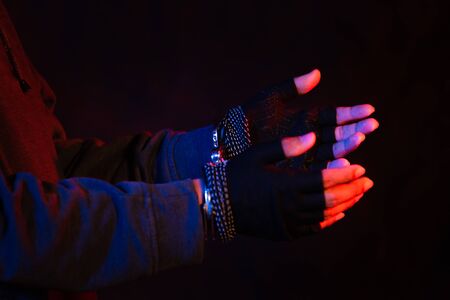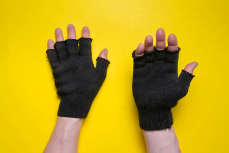 Hands in black gloves is asking for an alms isolated on the yellow background.