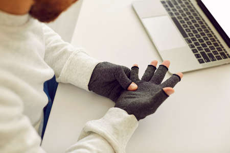Young man who suffers from rheumatoid arthritis wearing pair of warm fingerless grey textile cotton spandex compression hand gloves for easing pain while working on notebook PC computer at office desk