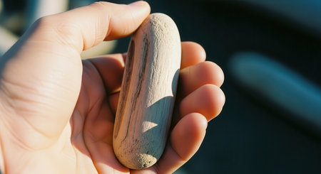 Hand holding a smooth, weathered piece of driftwood, showcasing its natural texture and organic form. sunlight illuminates the wood, highlighting its journey from nature.