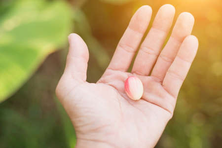 Close-up images of people taking or holding a medicine pill in hand which help and protect from pandemic virus and relief them from unhealthy and sickness. studio shot and clear background.