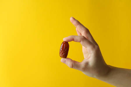 Female hand hold date fruit on yellow background