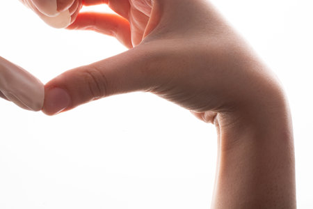 Woman hand wearing pink finger cots rubber protect help prevent fingerprints on the finger touched piece with poinging finger, studio shot isolated on white background