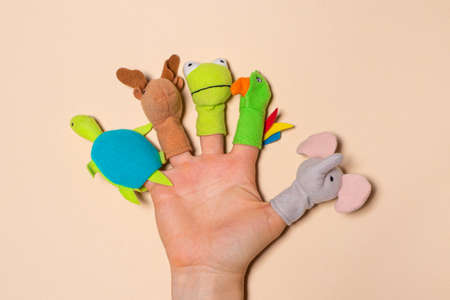 Fingers toys made of fabric on the hand on a beige background. Fingers Theater