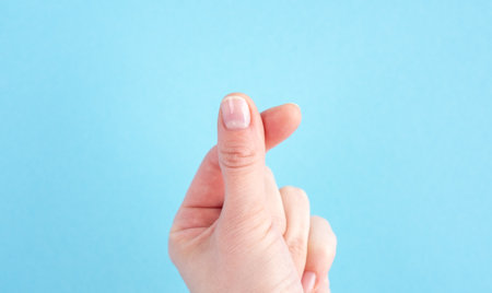 The crossed thumb and index finger symbolizes a small heart called mini heart, believed to be from South Korea.