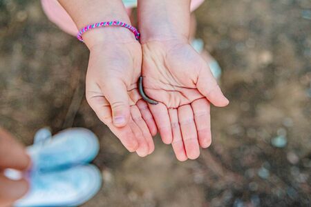 Millipede, Diplopoda, on the hands of a girl.