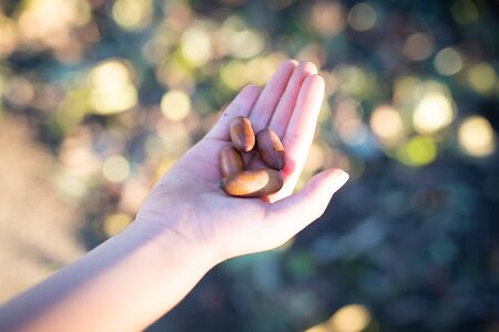 Dirty childs hands full of oak acorns, close up.