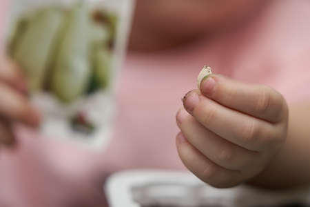 A child's hand with a seed that will be planted on seedlings in a container. Blurred background. close-up.