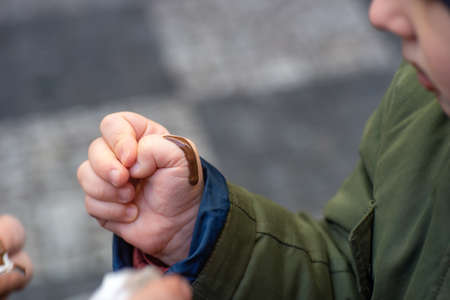 close-up, a worm in the hand of a man who wants to put it on the hook, against the background of the handle of the fishing rod