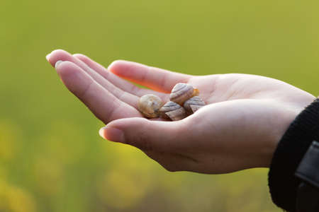 Top view of a tiny snail crawling on a finger of a toddler over a green grass.