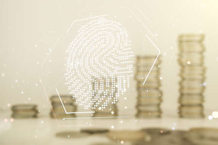 Abstract virtual fingerprint illustration on coins background, personal biometric data concept. Multiexposure