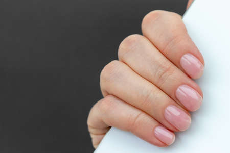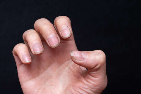 Close-up of female caucasian hand with dirty brittle nails, broken nails on a black background. Peeling on nails