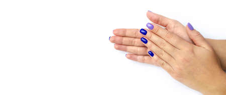 Stylish trendy women's manicure. Blue and lilac color gel Polish. The view from the top. Care. Female hand. White background. Isolated.