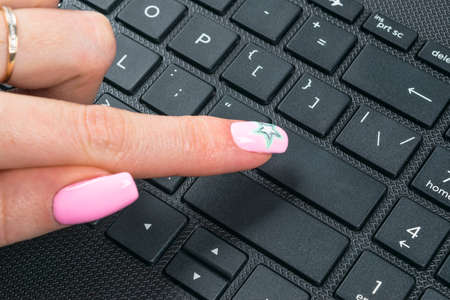 Close up view of a Finger Pushing on a empty Button of computer Keyboard. Finger Pressing a Slim Aluminium Keyboard Button. Modern Laptop Keyboard. Empty space for text