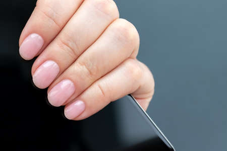 Female hand with beautiful manicure - pink nude nails with smartphone on gray background
