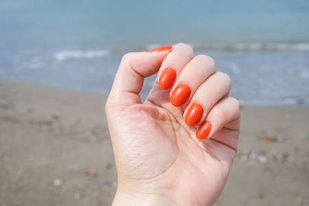 Female hand with red nail design. Glitter red nail polish manicure. Nail design for perfect summer vacation