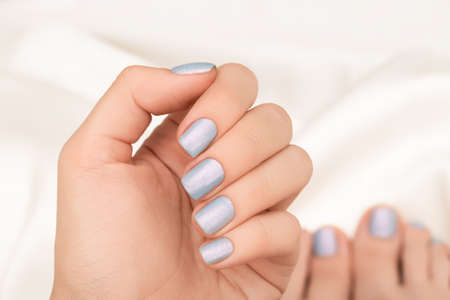 Female hand with blue nail design. Glitter blue nail polish manicure. Female hand and feet on white fabric background.