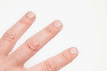 A human showing his big and dirty nails on white background