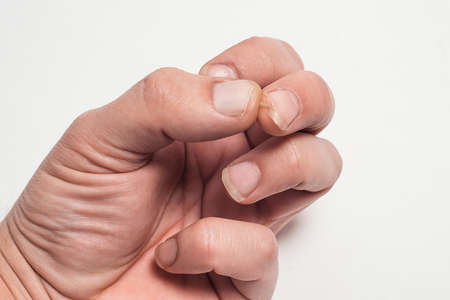 A man's hand with bitten and ugly fingernails. Bad care of hands