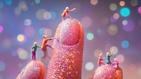This whimsical image showcases tiny figurines playfully interacting atop sparkly fingertips with a vibrant bokeh background, evoking creativity and joy.
