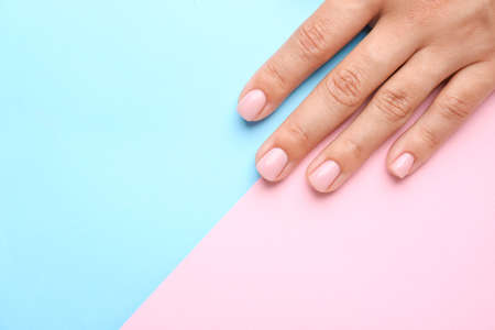 Female hand with beautiful manicure on color background